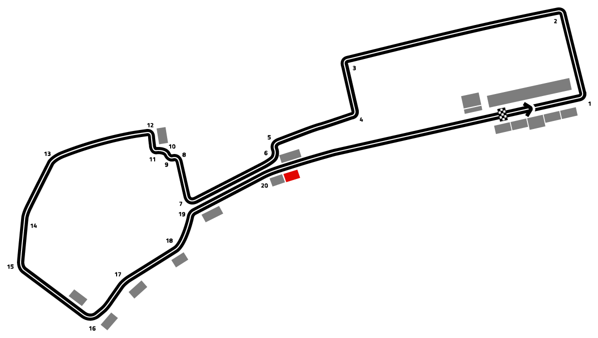 Situated after Turn 20 with great views of the drivers reaching high speeds as they head towards the Finish Line.